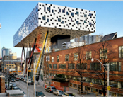 Just a mention of another wonderful structure in Ontario’s fair city – the Sharp Centre for Design, at Ontario College of Art & Design, by architect Will Alsop. It could be confused with a giant Memphis Style table built and hovering above the other more staid school buildings, looking a bit spindly-legged like a newborn fawn. Perfect as an art school building, it is art itself. The twelve primary-colored legs resemble a pack of Crayolas unwrapped, and the black and white design (“pixilated”) of the building’s exterior cleverly disguises not only the windows but also the massiveness of the building, as does the floating illusion. It also serves as a gateway into and a roof over a park where all the students get a little fresh air, a transition from busy street to green open space. Though it messes with your mind and looks like an alien vessel that has landed in amongst the surrounding cityscape, ready to suction up the samples below it for analysis, it sits playfully, invitingly, happily on its site, and you can’t imagine the streetscape without it. As clever a use of air space on an over-crowded site as you’ll likely see, it doesn’t intrude and it makes you smile, and as a piece of architecture it does so much more than is required of it. It is sui generis and yet, in arslocii vernacular, both it and its environment are enhanced by each other, the whole greater than the sum.